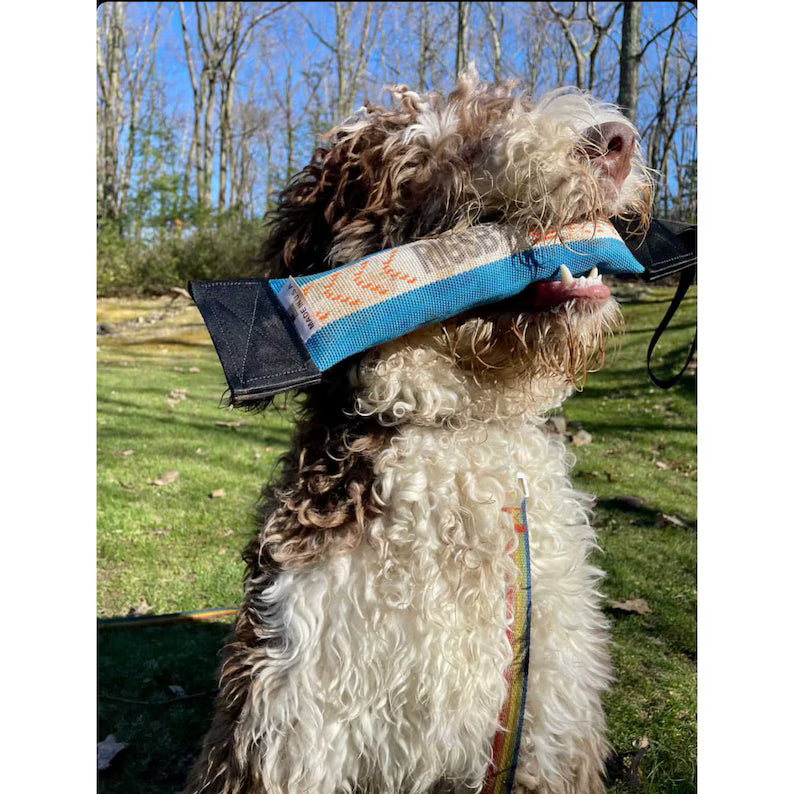Each end of the fire hose is sewn with super strong polyester UV protected outdoor thread. Each end of the fire hose is finished and sealed off with the same super strong matieral vehicle manufacture's use for seat belts. The dog toy also has a handle for easy transport or something to grab onto while tugging. The handle is made from strong double tick binding and has a soft center for a comfortable grip. Inside of the dog toy is a super soft 100% cotton batting so its easy and soft for your pet to hold in their mouth.
